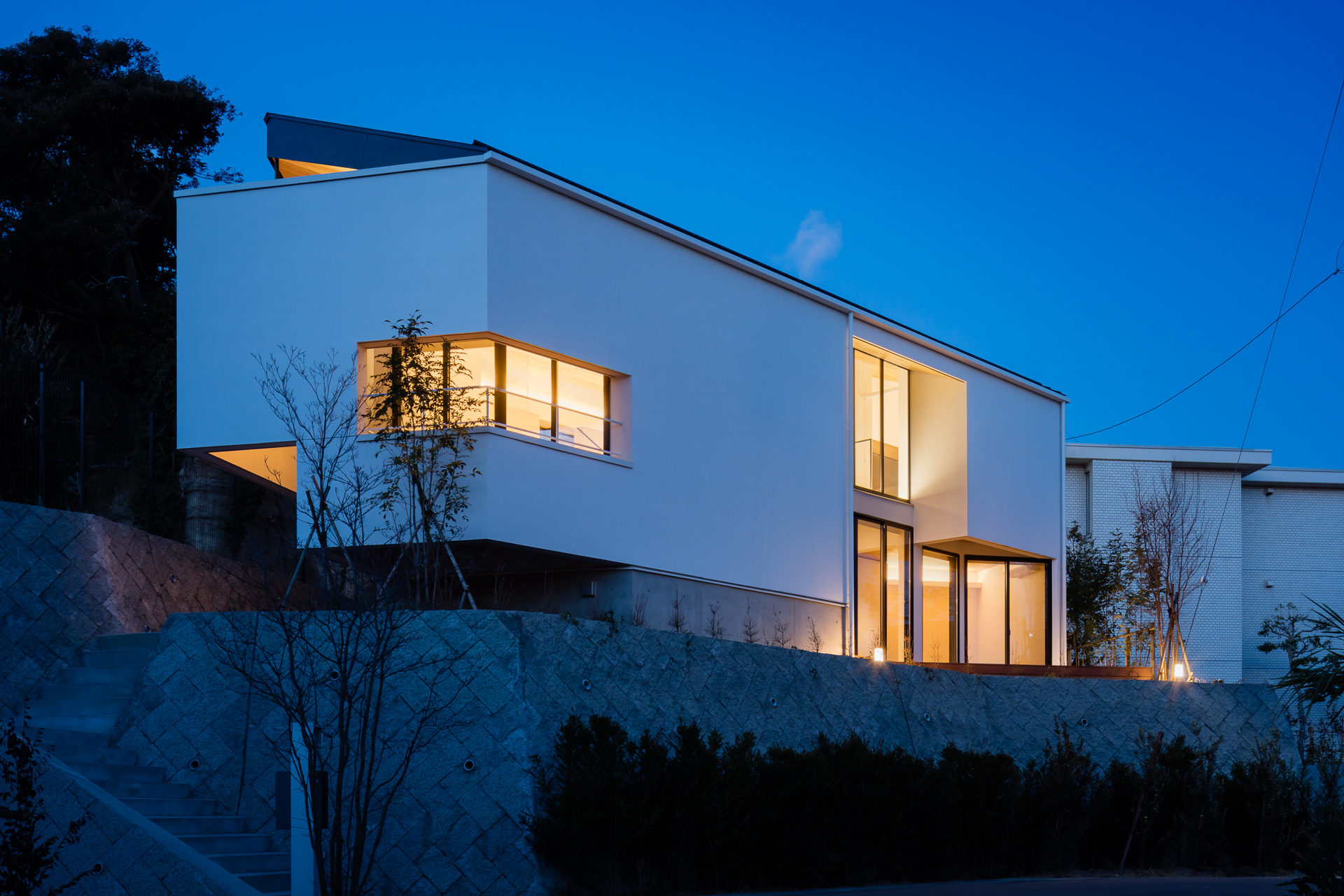 江ノ島に程近い、相模湾に向けて傾斜した地形の頂部に位置する計画地は、新たに開発された敷地の一角にあり、擁壁によって形成された特徴的な形状をしている。 施主の要望である海の見える眺望と周辺環境の取り込み方、また、敷地の特徴を活かしながら、施主のライフスタイルを素直に空間に表現する計画を提案した。地形の段差を内部にも連続させたスキップフロアに外部空間を織り交ぜ、大きな1枚屋根で包むことにより、内・外部の境界が曖昧になった大きなワンルーム空間を構成している。仕切りの無い一繋がりの空間には、段差や階段、外部テラスなどのエレメントによって緩やかに「場」が生み出され、各々の気配を家のどこにいてもお互いを感じることができる。斜めに切り取られた勾配の異なる屋根、角度をつけた壁、視線の方向を意識した開口部によって空間に動きを創り出し、平面的な面積では推し量れない大きな空間的ヴォリュームを生み出している。若い家族の成長と共に変わっていく「場」の変容を受け入れるように1枚の大屋根で包み込まれた「おおらかさ」と「包容力」をもった空間を建築の構成として表現した住宅である。